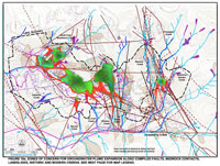 | Zones of concern for groundwater plume expansion along compiled faults, bedrock contacts, landslides, historic and modern creeks. See report pg. 46 for legend. |